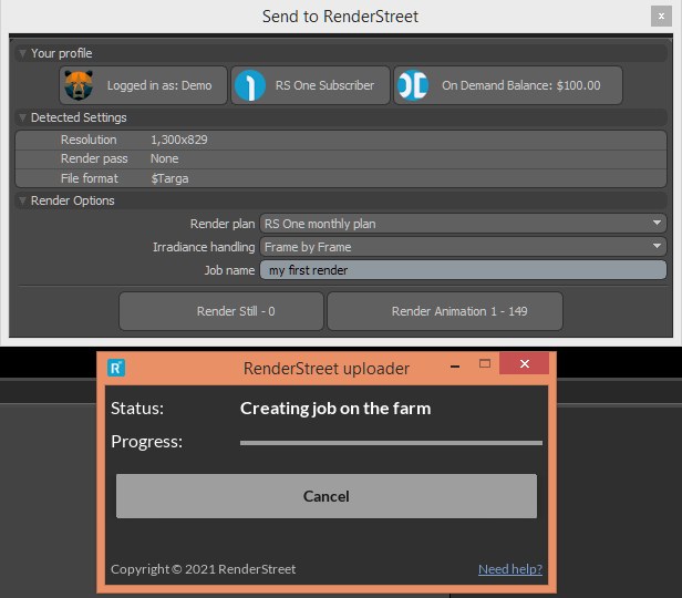 Once the process has been completed, the uploader window will auto-close. You can then follow up the progress of the render in your